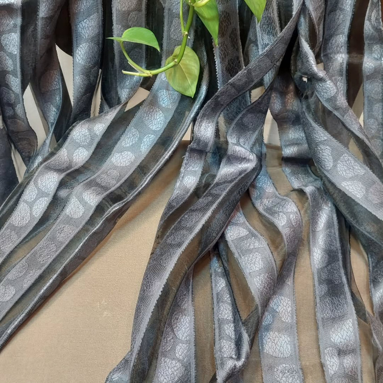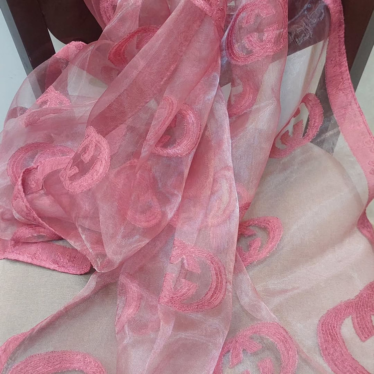 شال مجلسی وارداتی شیشه ای، روی سر ایستایی دارد و تکرنگ با طرح راه راه سنگی طوسی و سبز صدری است. و یک طرح گوچی شیشه ای