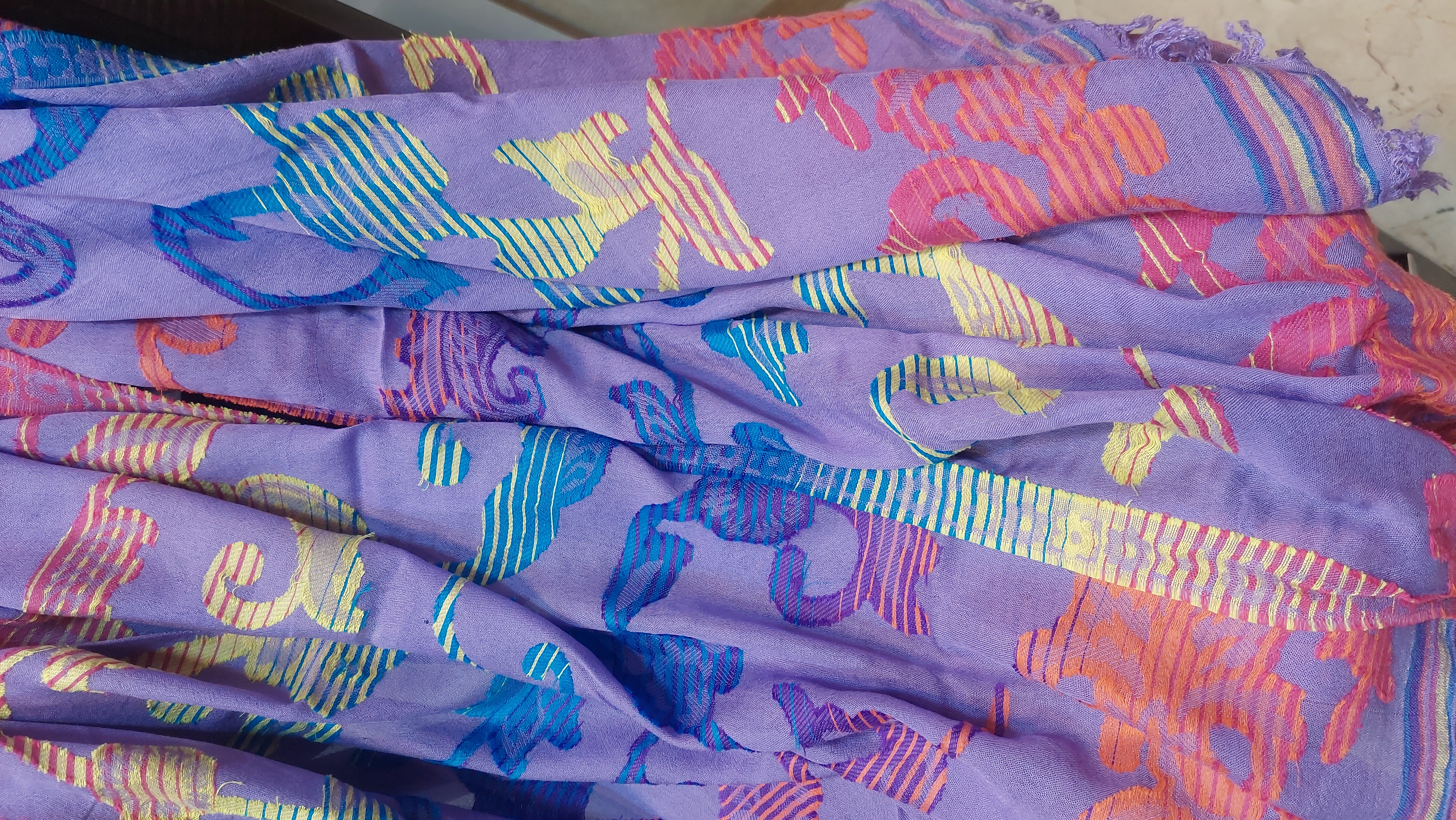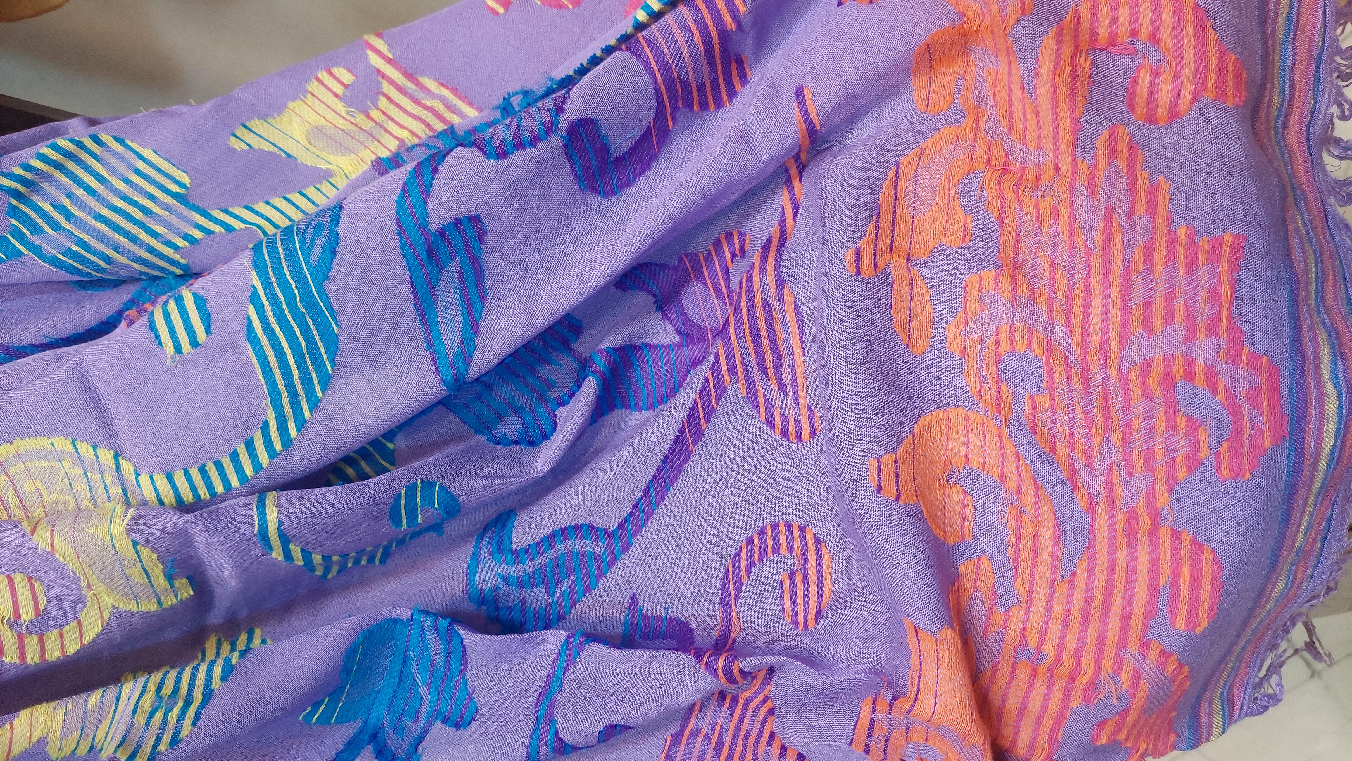 شال نخ خیلی خوش رنگ وارداتی دو رویه یه رو طرحهاش برجسته است مثل مخمل دیده میشه یک رو برجسته نیست روی سر اصلا لیز نیست