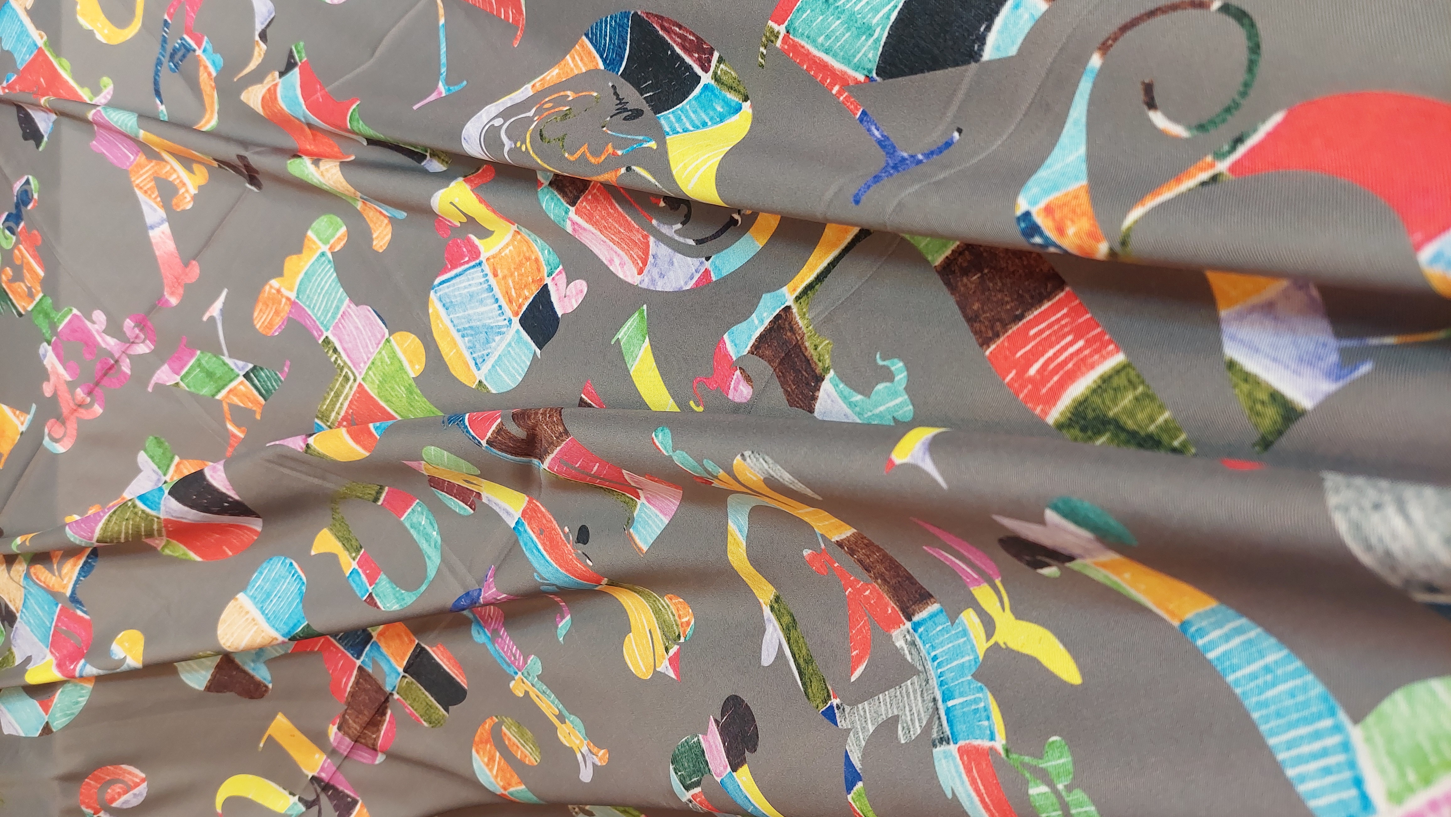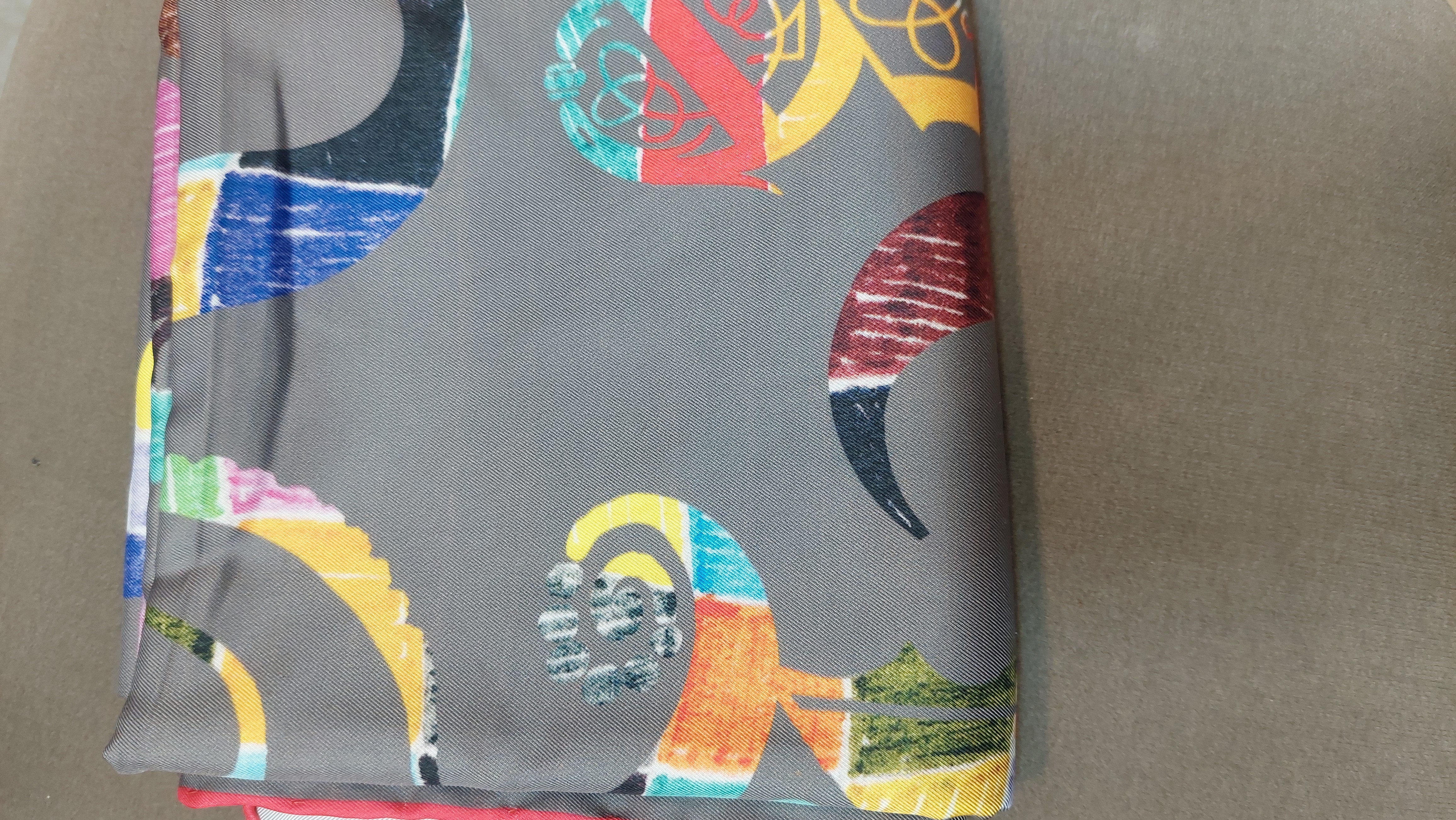 روسری توییل ابریشم قواره ۱۴۰ دور دستدوز وارداتی اصلا به هیچ عنوان سر نمیخوره روی سر تکرنگ زمینه طوسی روشنه با رنگهای شاد و ست پذیر که داخل روسریه