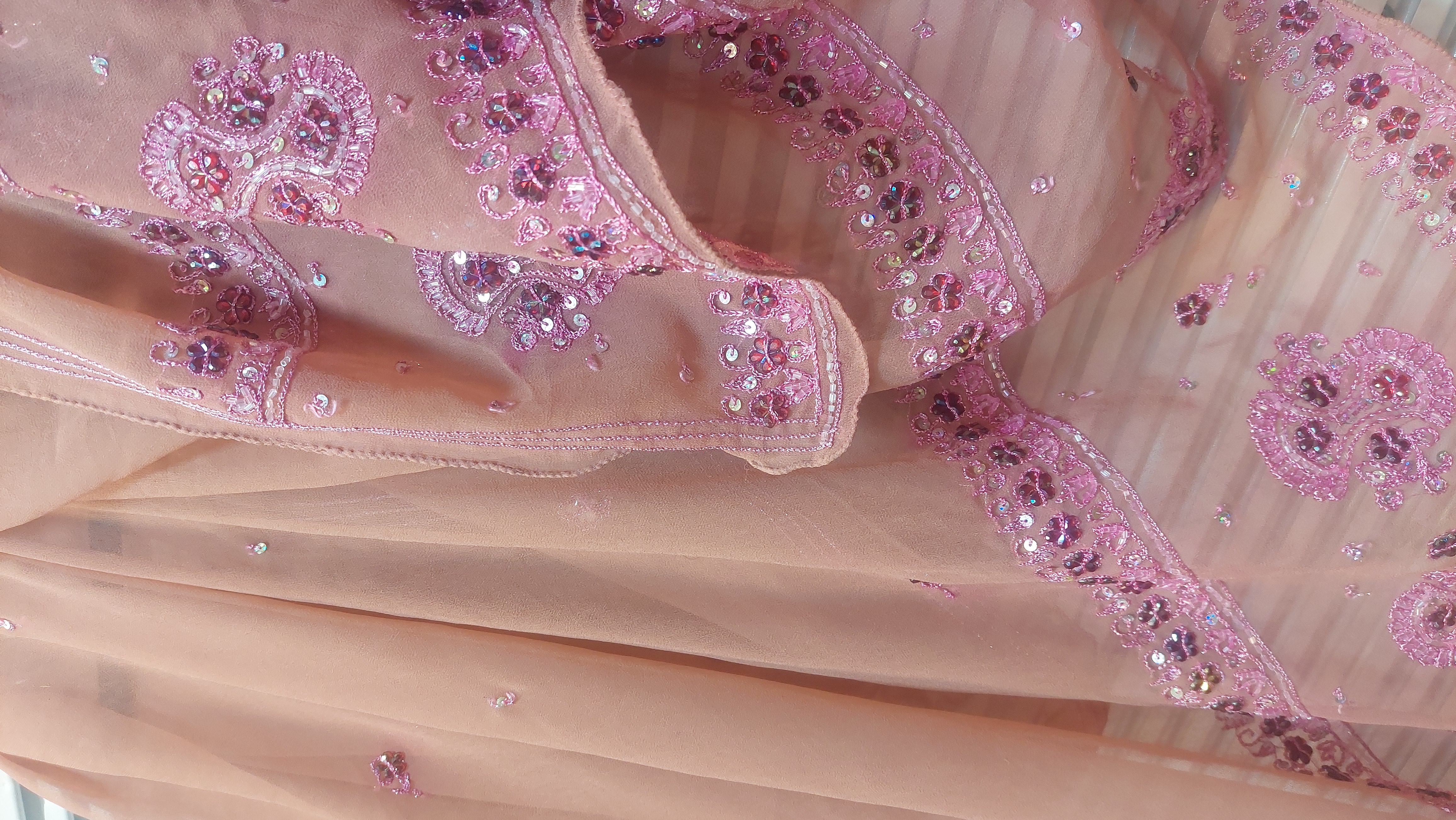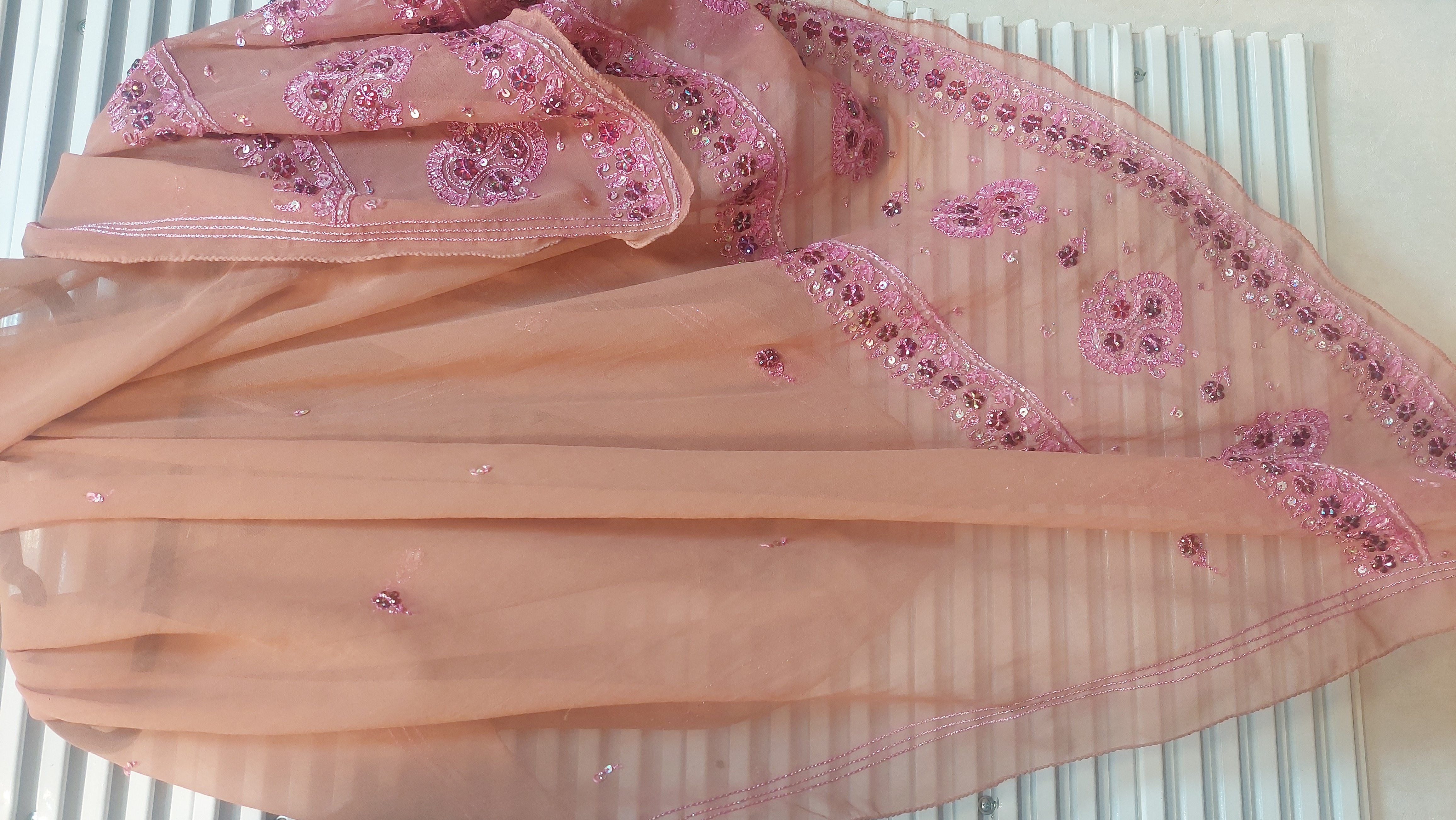 دست شال تمام ملیله دوزی و سنگ دوزی شده دور تا دور شال گلدوزی و وسط کار سنگدوزیهای پراکنده کار شده